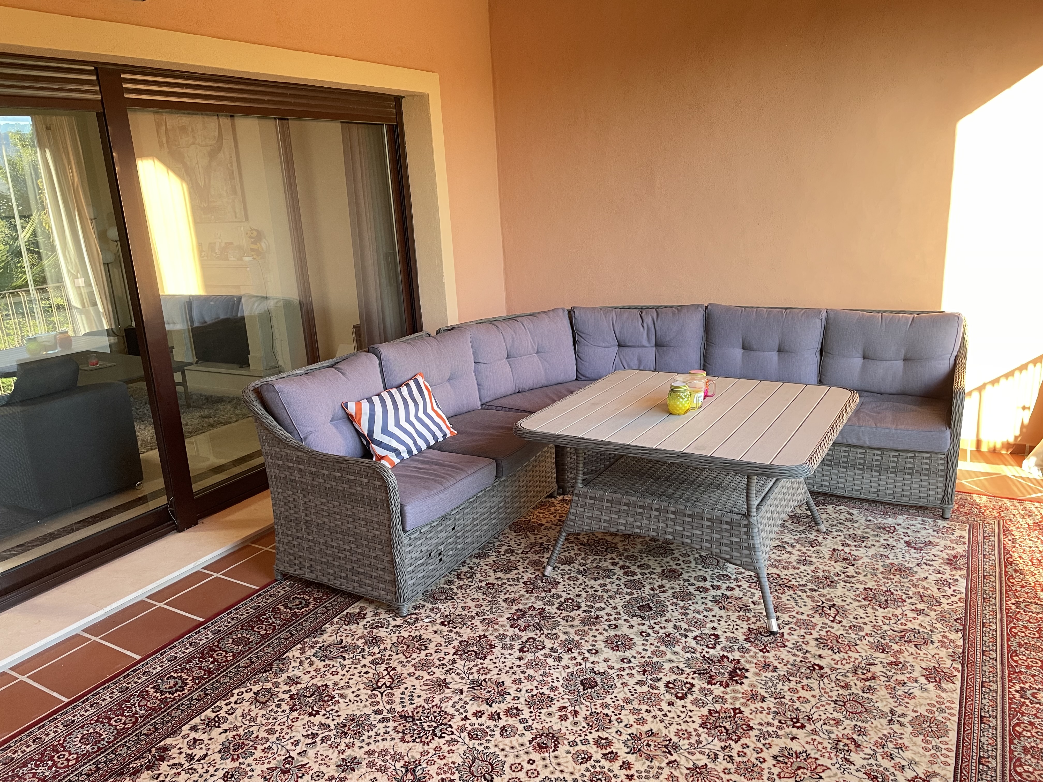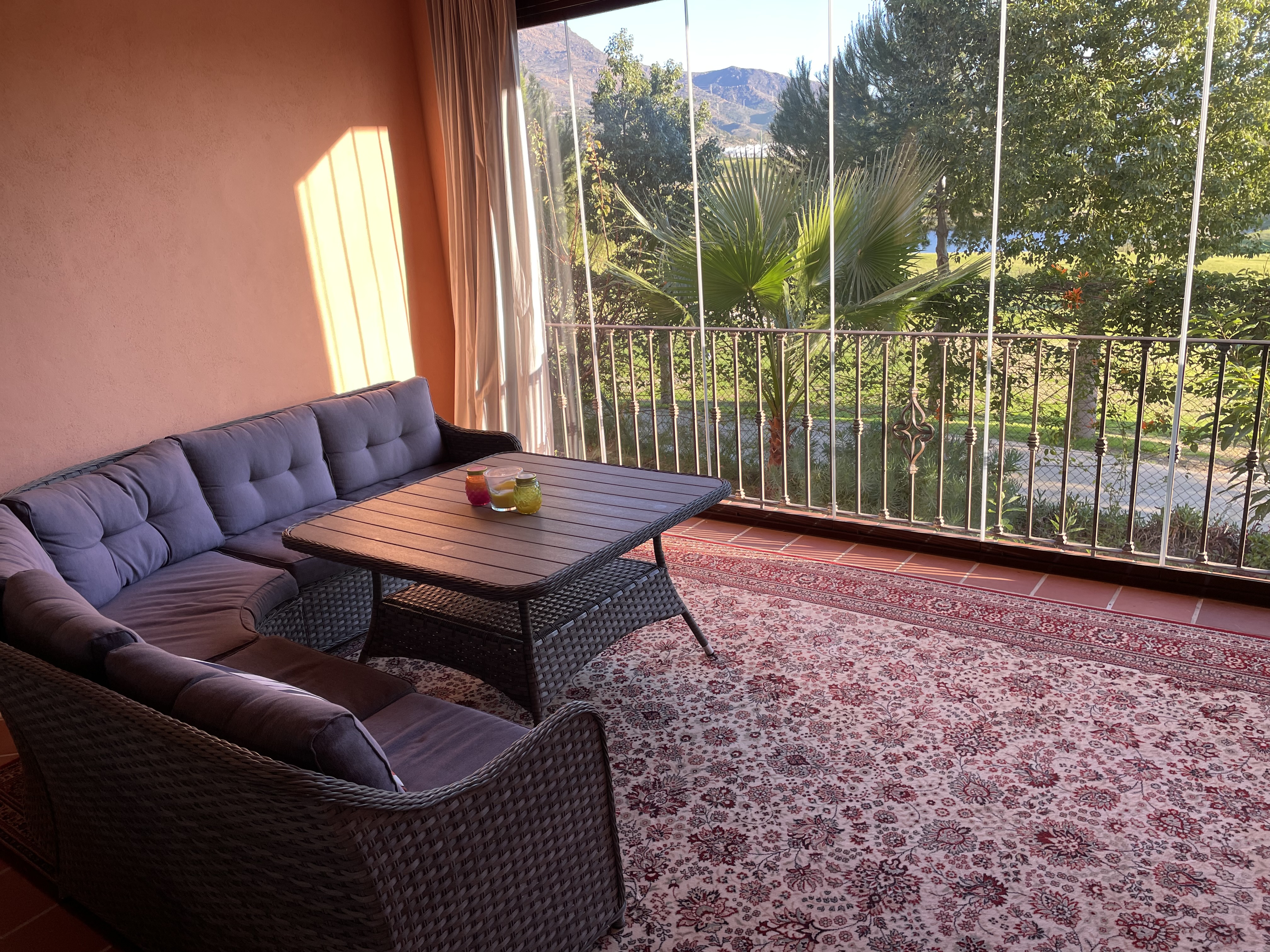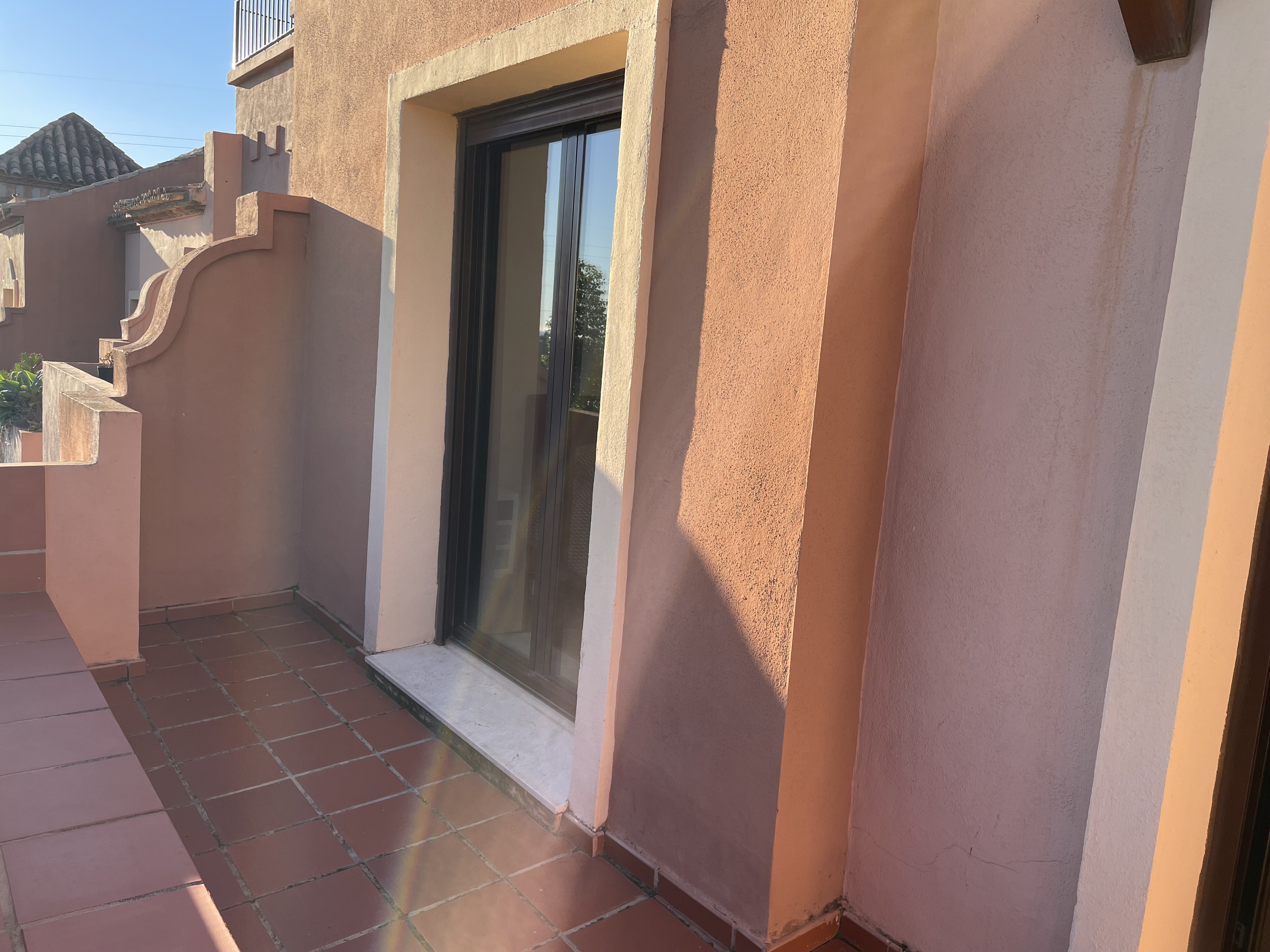 Upon entering, you are greeted by a stunning galleried staircase that immediately enhances the sense of space. The ground floor features a modern kitchen, guest WC, a generous lounge/dining area, and a large terrace enclosed with glass curtains—perfect for all-year-round enjoyment. Upstairs, the property comprises three double bedrooms. Two bedrooms are served by a shared shower room with twin sinks and a WC located on the landing. The master suite boasts an open-plan en-suite bathroom with twin sinks, a WC, and a spa bath with shower attachment. Both the master bedroom and one guest bedroom offer direct access to a terrace with breathtaking panoramic views of Azata Golf, the Sierra Bermeja mountains, and the Mediterranean Sea.
